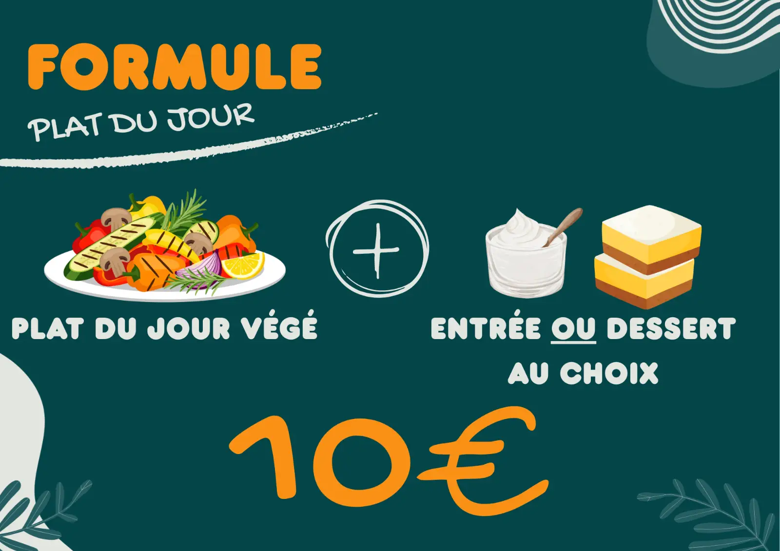 • Une formule plat du jour végé avec entrée ou dessert à 10€