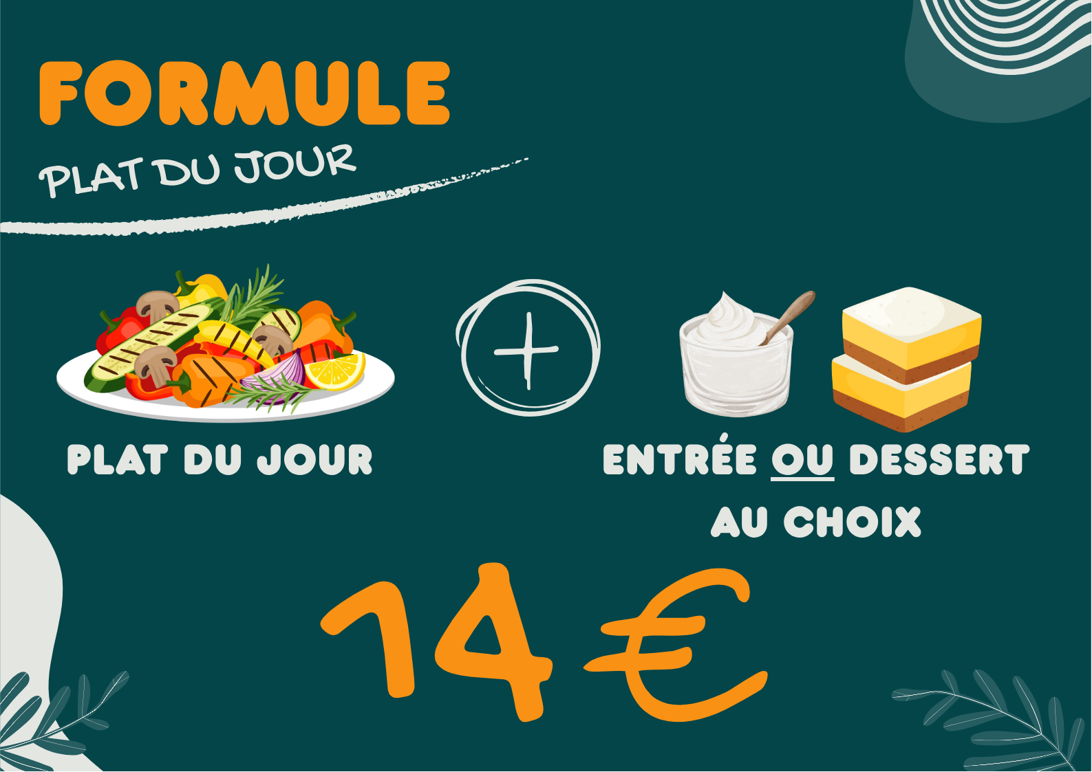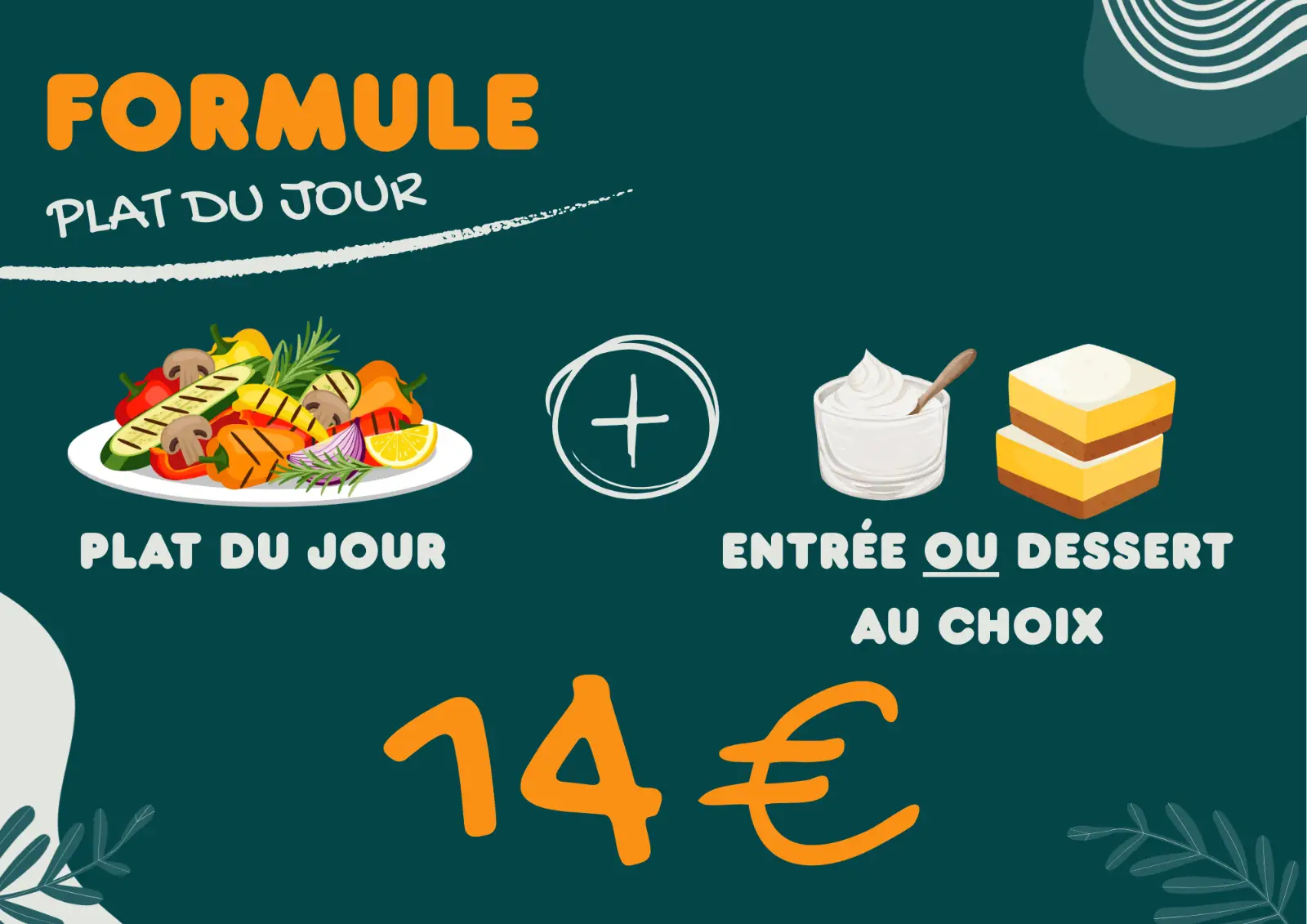 • Une formule plat du jour viande avec entrée ou dessert à 14€